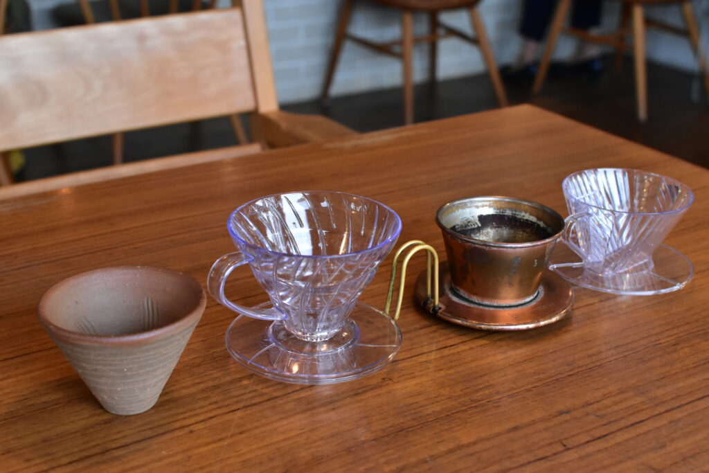 看板メニューのスペシャルティコーヒーに使用する豆は、オーナーがなるべく現地で買い付けしたもの。カップだけでなく、コーヒーを淹れる器具までカスタムできるので通えば通うほど、自分好みの一杯をいただけます。ドリップ器具、一番左は地元・備前焼のもの。