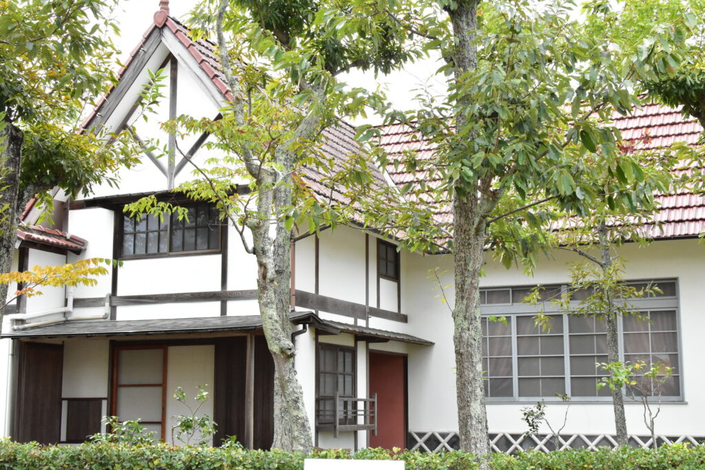 「夢二生家記念館」は、大正の芸術家・竹久夢二が少年時代を過ごした家を保存しているかやぶき屋根の建築物。
