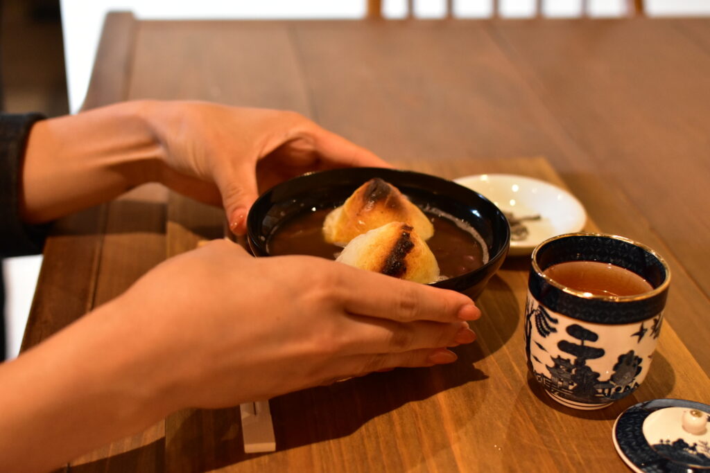 夢二の好物だったといわれるおぜんざい。焼き餅が甘い汁を吸って、体の芯から温まります。